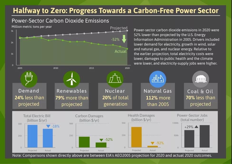 按照當(dāng)時的預(yù)測,從2005年到2020年,美國電力部門的二氧化碳年排放量將從24億噸上升到30億噸。但是,2020年的實際排放量降至14.5億噸,電力行業(yè)的排放量削減了52%??梢哉f,美國的凈零排放之路已經(jīng)走了一半。