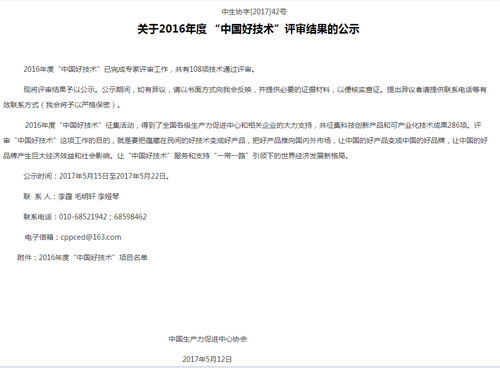 關(guān)于2016年度“中國好技術(shù)”評(píng)審結(jié)果公示