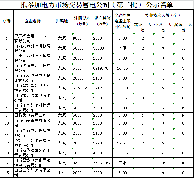 中科宇杰:關(guān)于山西省第二批參加電力市場(chǎng)交易售電公司名單