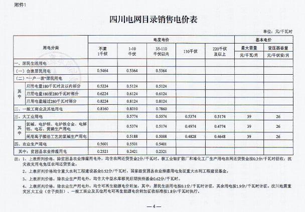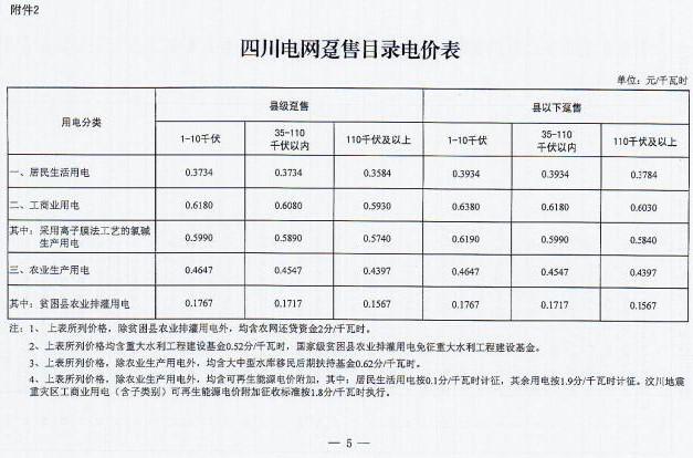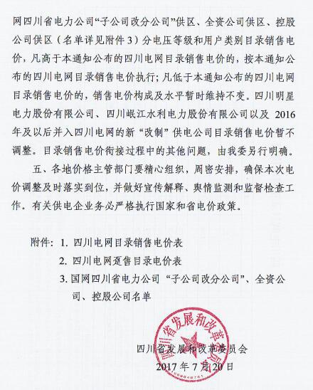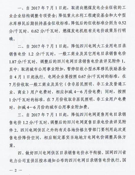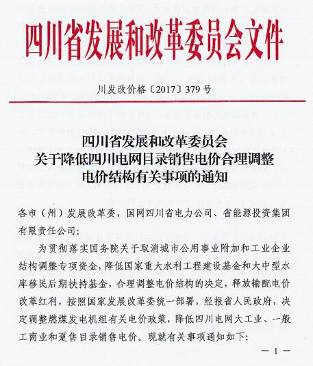 近日,四川省發(fā) 改 委發(fā)布了《四川省發(fā)展和改革委員會關(guān)于降低四川電網(wǎng)目錄銷售電價合理調(diào)整電價結(jié)構(gòu)有關(guān)事項的通知》(以下簡稱“通知”)。通知指出,自2017年7月1日起,取消向燃煤發(fā)電企業(yè)征收工業(yè)企業(yè)結(jié)構(gòu)調(diào)整專項資金,降低重大水利工程建設基金和中大型水庫移民后期扶持基金征收標準,降低后的征收標準分別為0.52分/千瓦時、0.62分/千瓦時。燃煤發(fā)電機組有關(guān)電價政策另行明確。具體情況如下: