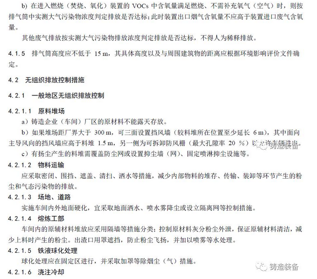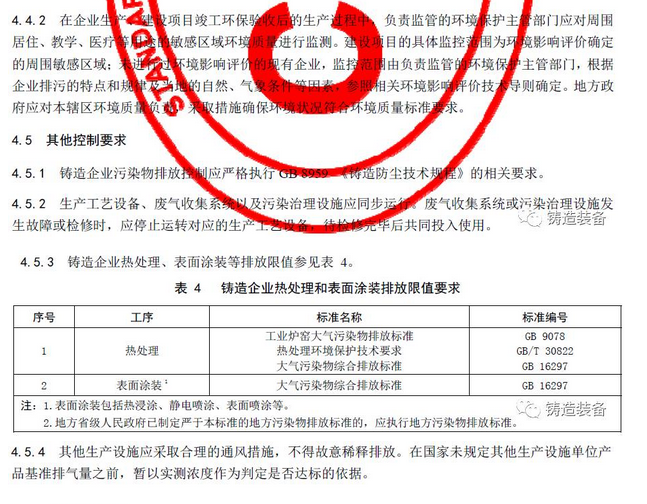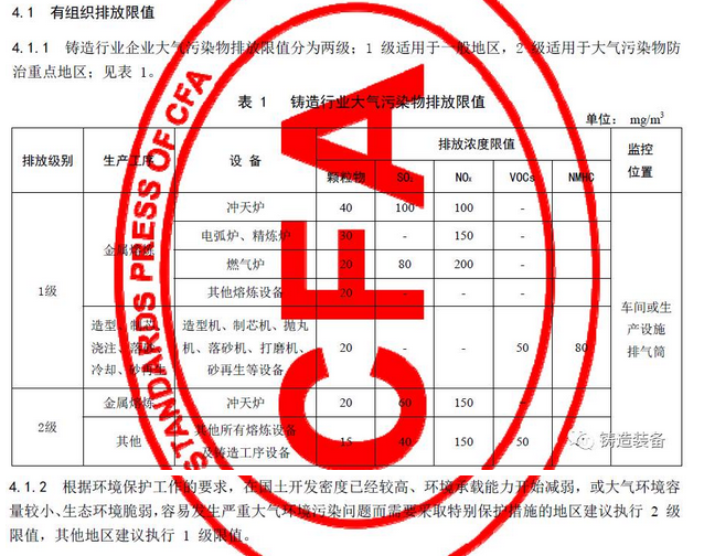 現(xiàn)摘錄T/CFA030802-2—2017中“4排放控制要求”、“5污染物監(jiān)測要求”、“6實施與監(jiān)督”部分。前三部分“1范圍、2規(guī)范性引用文件、3術(shù)語與定義”請自行登錄中國鑄造協(xié)會網(wǎng)站查閱。
