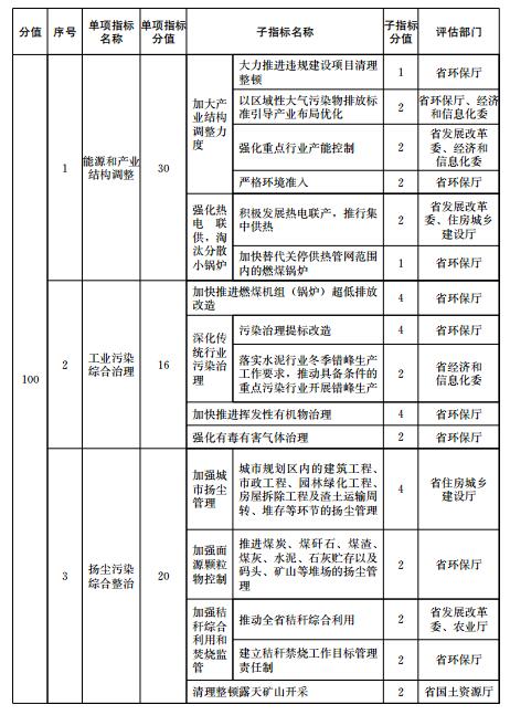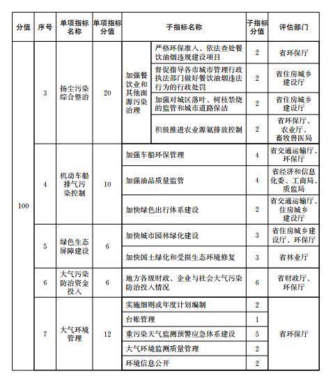 大氣污染防治重點任務完成情況包括能源和產業(yè)結構調整、工業(yè)污染綜合治理、揚塵污染綜合整治、機動車船排氣污染控制、綠色生態(tài)屏障建設、大氣污染防治資金投入、大氣環(huán)境管理等7項指標。大氣污染防治重點任務完成情況各指標的定義、評估要求和計分方法等由有關評估部門按照《二期行動計劃》的職責分工確定,評估部門根據子指標分值對各市重點任務進行打分,并向省環(huán)保廳提供評分結果。評估部門為兩個部門以上的,各評估部門分別打分后取平均值作為本項重點任務得分。