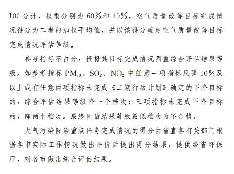 第四條評估采用評分法,空氣質量改善目標完成情況和大氣污染防治重點任務完成情況滿分均按滿分100分計,綜合評估結果為二者的加權平均值,權重分別為60%和40%。評估結果分為優(yōu)秀、良好、合格、不合格四個等級,其中,評分結果90分及以上為優(yōu)秀、70分(含)至90分為良好、60分(含)至70分為合格、60分以下為不合格。根據參考指標目標完成情況調整綜合評估結果等級作為最終評估結果。參考指標PM10、SO2、NO2中任意一項指標反彈10%及以上或有任意兩項指標未完成《二期行動計劃》確定的下降目標的,綜合評估結果等級降一個檔次;三項指標未完成下降目標的,降兩個檔次。最終評估結果等級最低檔次為不合格。
