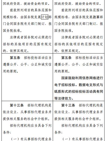 二、第五條增加一款,作為第二款:“國家鼓勵利用信息網(wǎng)絡進行電子招標投標。數(shù)據(jù)電文形式與紙質形式的招標投標活動具有同等法律效力。”