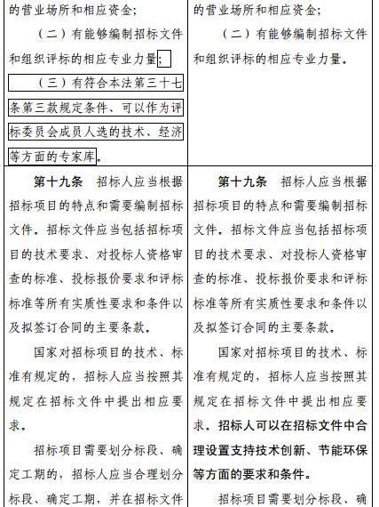 在對招標法第19條的修改中,在保留原有“國家對招標項目的技術、標準有規(guī)定的,招標人應當按照其規(guī)定在招標文件中提出相應要求”內容的基礎上,增加了“招標人可以在招標文件中合理設置支持技術創(chuàng)新、節(jié)能環(huán)保等方面的要求和條件”的內容,加重了創(chuàng)新和節(jié)能環(huán)保在招投標中的考量力度。
