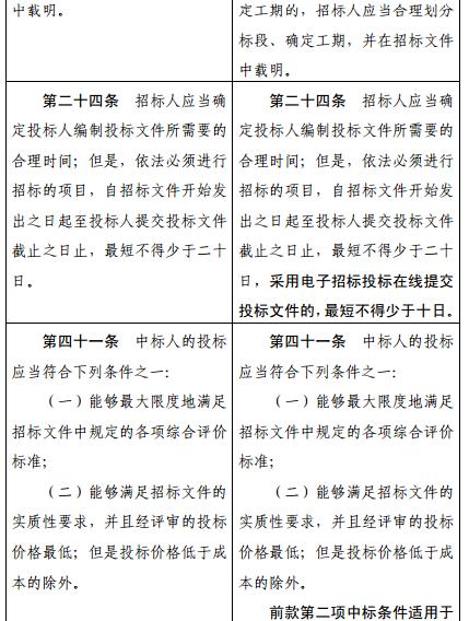 五、將第二十四條修改為:“招標人應當確定投標人編制投標文件所需要的合理時間;但是,依法必須進行招標的項目,自招標文件開始發(fā)出之日起至投標人提交投標文件截止之日止,最短不得少于二十日,采用電子招標投標在線提交投標文件的,最短不得少于十日?!?/p>