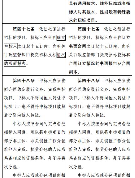七、將第四十七條修改為:“依法必須進行招標的項目,招標人應當自訂立書面合同之日起十五日內,向有關行政監(jiān)督部門提交招標投標和合同訂立情況的書面報告及合同副本?!?/p>