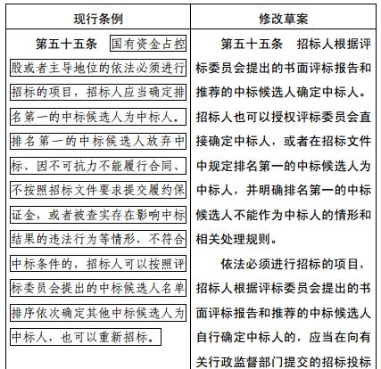 一、將第五十五條修改為:“招標人根據(jù)評標委員會提出的書面評標報告和推薦的中標候選人確定中標人。招標人也可以授權評標委員會直接確定中標人,或者在招標文件中規(guī)定排名第一的中標候選人為中標人,并明確排名第一的中標候選人不能作為中標人的情形和相關處理規(guī)則。