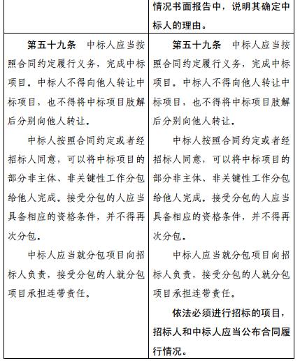 二、第五十九條增加一款,作為第四款:“依法必須進行招標的項目,招標人和中標人應當公布合同履行情況?!?/p>