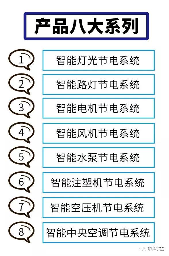 中科宇杰的產(chǎn)品以無縫式嵌入和智能化為核心,特別針對用能單位設(shè)備的特點,在完全不影 響用能單位設(shè)備正常運行和改變設(shè)備運行參數(shù)的前提下,達到節(jié)電的目的,實現(xiàn)用能設(shè)備和中科宇杰節(jié)電機的無縫銜接,經(jīng)過十多年發(fā)展,中科宇杰的產(chǎn)品已經(jīng)形成了8大體系。