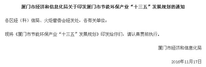 廈門市經(jīng)濟和信息化局關(guān)于印發(fā)廈門市節(jié)能環(huán)保產(chǎn)業(yè)“十三五”發(fā)展規(guī)劃的通知: