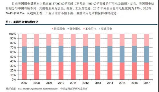 而美國則是居民和商業(yè)用電合計(jì)超過了70%,工業(yè)用電不到30%。