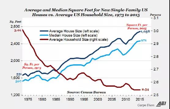 當(dāng)然了,國內(nèi)家庭各種家用電器也不少,怎么會(huì)跟美利堅(jiān)老百姓有這么大的差距呢?首先我們的城市化水平還不如美國,還有幾億人住在農(nóng)村。其次美國的人均住房面積大,比歐洲和中國都大不少,會(huì)帶來對空調(diào),燈具和其他家電的使用也更為奢侈,下圖是美國的2015年新建的獨(dú)棟房屋的人均住房面積達(dá)到了1038平方英尺,超過96平米了,注意這可是人均啊,怪不得國內(nèi)中產(chǎn)和土豪都喜歡去北美買大house。