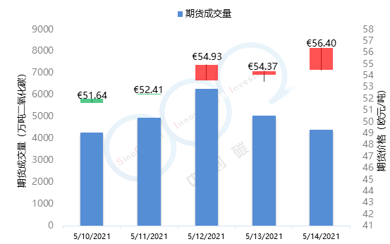 - 2021年5月10日至5月14日,由于歐盟碳市場投資者的強(qiáng)勢買盤以及歐盟氣候負(fù)責(zé)人對于歐盟碳價較為消極的干預(yù)政策,歐盟碳價在本周再次呈現(xiàn)較大漲幅并接連刷新記錄,由51.64歐元/噸上漲至56.40歐元/噸,漲幅達(dá)9.22%。