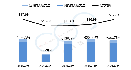 加州-魁北克碳市場的初始配額發(fā)放以拍賣為主,每個季度舉行一次拍賣。2021年2月拍賣均價為17.83美元,較上一季度漲幅為5%,總成交量為6308萬噸。以下是由中創(chuàng)碳投統(tǒng)計的加州-魁北克碳市場近一年的交易情況。