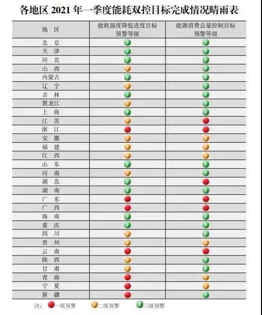 為貫徹落實(shí)黨中央、國務(wù)院關(guān)于強(qiáng)化能源消費(fèi)總量和強(qiáng)度雙控的決策部署,加強(qiáng)能耗雙控形勢(shì)分析預(yù)警,國家發(fā)展改革研究提出了《各地區(qū)2021年一季度能耗雙控目標(biāo)完成情況晴雨表》。