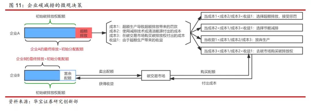 按照華寶證券的分析,有效碳市場(chǎng)的碳排放權(quán)的價(jià)格就是企業(yè)的邊際減排成本。在企業(yè)微觀決策上,主要是將碳減排成本、超額碳排放成本、購買碳配額的成本與超額排放生產(chǎn)帶來的收益進(jìn)行比較,并作出相應(yīng)決策。