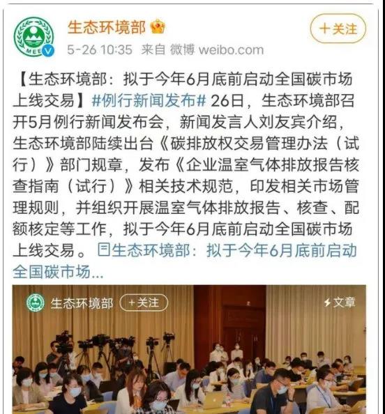 26日?據(jù)生態(tài)環(huán)境部官方微博消息,擬于今年6月底前啟動全國碳市場上線交易。