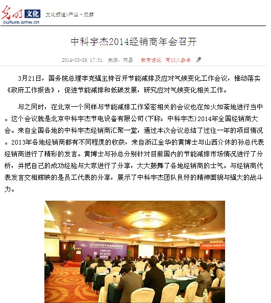 與之同時(shí),在北京一個(gè)同樣與節(jié)能減排工作緊密相關(guān)的會(huì)議也在如火如荼地進(jìn)行當(dāng)中。這個(gè)會(huì)議就是北京中科宇杰節(jié)電設(shè)備有限公司(下稱:中科宇 杰)2014年全國(guó)經(jīng)銷商大會(huì)。來自全國(guó)各地的中科宇杰經(jīng)銷商匯聚一堂,通過本次會(huì)議總結(jié)了過往一年的項(xiàng)目情況。2013年各地經(jīng)銷商都有不同程度的收 獲,來自浙江金華的黃博士與山西介休的孫總代表經(jīng)銷商進(jìn)行了精彩的發(fā)言。黃博士與孫總分別針對(duì)目前國(guó)內(nèi)的節(jié)能減排市場(chǎng)情況進(jìn)行了分析,并把自己的成功經(jīng)驗(yàn) 與大家進(jìn)行了分享,大大鼓舞了各地經(jīng)銷商的士氣。與經(jīng)銷商代表發(fā)言交相輝映的是員工代表的分享,展示了中科宇杰團(tuán)隊(duì)良好的精神面貌與強(qiáng)大的戰(zhàn)斗力。